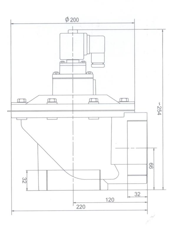 DMF-T型電磁脈沖閥為直通閥,其進氣口之間夾角為180°(進出口中心線為同一直線),其進口與儲氣筒連接,出口與噴吹管連接。氣流暢通,該脈沖電磁閥能提供符合要求的清灰氣脈沖