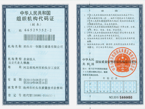 一恒組織代碼證-一恒組織代碼證-泊頭市一恒除塵設備有限公司